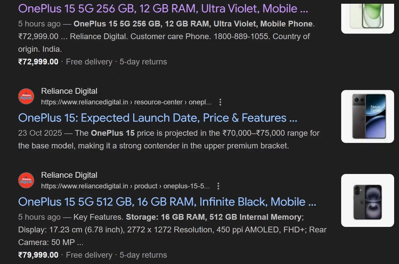 The OnePlus 15 is reportedly going to cost around ₹72,999 in India for the base 12 GB + 256 GB model, representing an increase of roughly ₹3,000 compared with the OnePlus 13’s launch price of ₹69,999. The higher starting price is being seen as the start of a broader trend of smartphone price hikes across brands in the Indian market. This price was originally spotted by Beebom on the Search Engine as the smartphone was briefly listed on the Reliance Digital online store. The page has now been removed.
