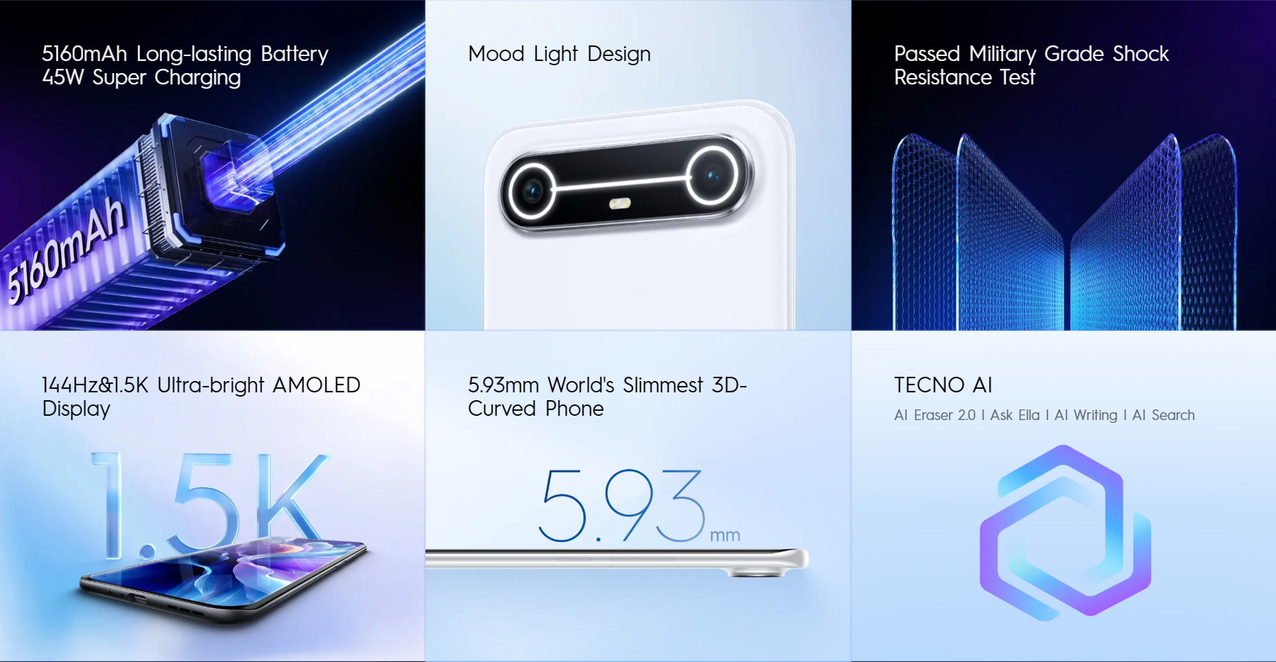 The inclusion of a relatively large 5160 mAh battery in a sub-6 mm frame stands out. It suggests TECNO has focused on internal stacking efficiency while preventing the typical compromise associated with ultra-slim phones, where battery endurance often suffers dramatically.